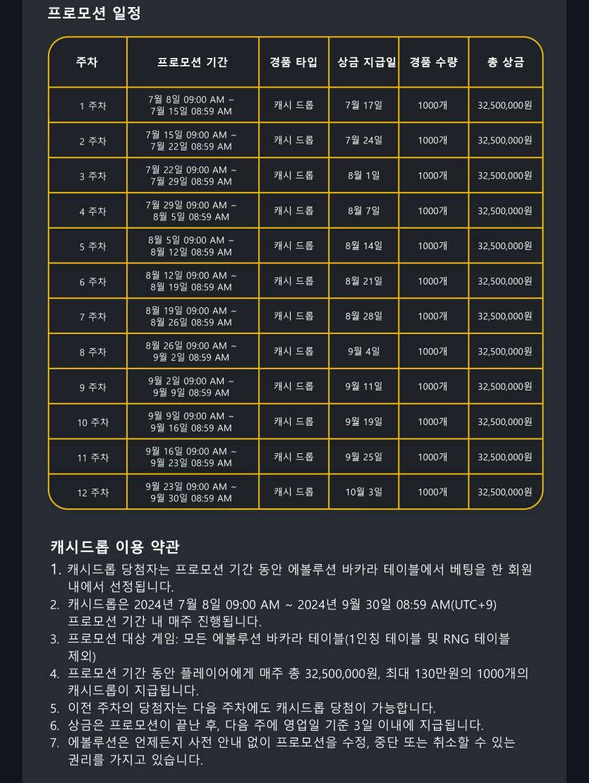 프로모션 기간 동안 에볼루션사 바카라 테이블에서 베팅 시 총 1,560,000,000원, 매주 32,500,000원의 상금이