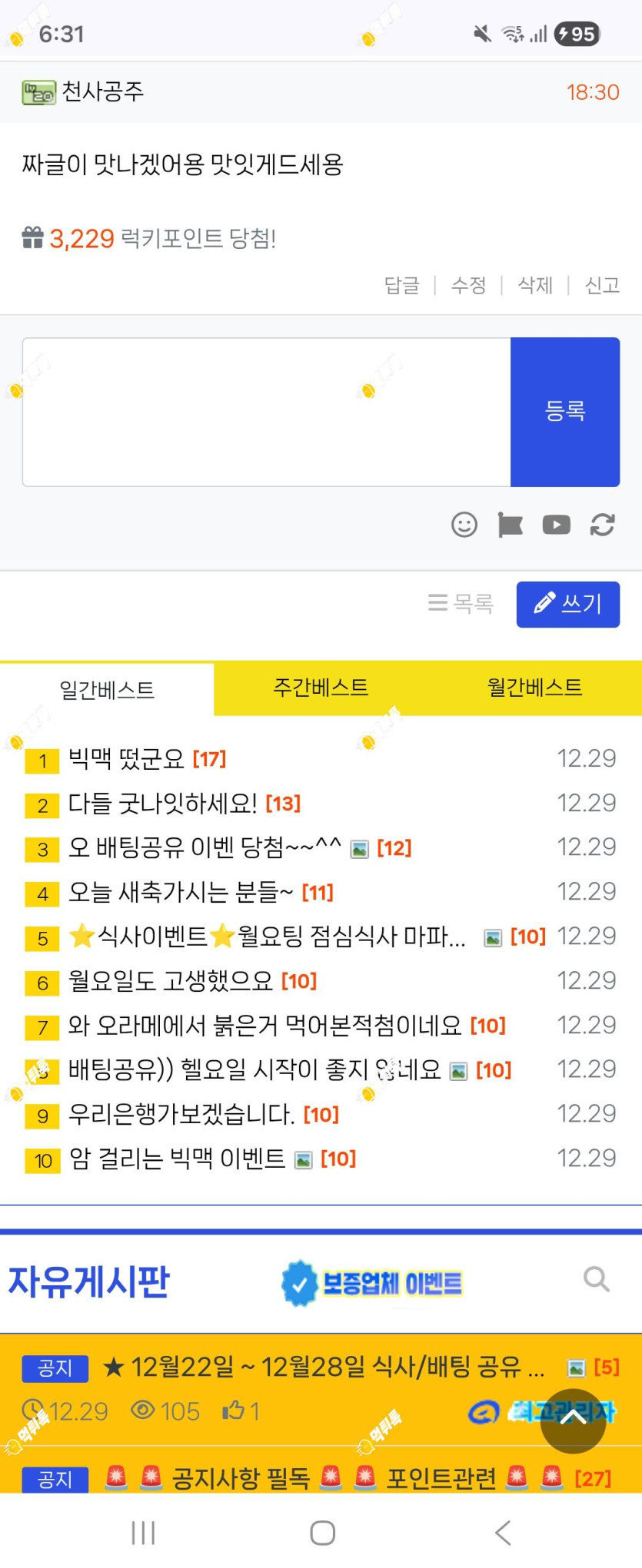 우오오오 럭포다!!! 작성자 정보 천사공주 작성 작성일 2025.12.30 18:32 컨텐츠 정보 28 조회 10 댓글 목록 본문 우오오오 럭포다!!!!다들 오늘하루 고생하셨어용ㅎㅎ 얼른 퇴근하셔서 맛있는 저녁드세용 0 추천 신고 관련자료 댓글 10 덕고다이님의 댓글 덕고다이 작성일 18:45 럭포 축하요 신고 럭포 축하요 천사공주님의 댓글의 댓글 천사공주 작성일 18:47 감샴당 덕고님ㅎㅎ 신고 감샴당 덕고님ㅎㅎ 덕고다이님의 댓글 덕고다이 작성일 18:49 수정됨 넵 신고 넵 머니환전님의 댓글 머니환전 작성일 19:16 축하드려요 신고 축하드려요 천사공주님의 댓글의 댓글 천사공주 작성일 19:22 감샴당 환전님ㅎㅎ 신고 감샴당 환전님ㅎㅎ 나랑드콜라님의 댓글 나랑드콜라 작성일 19:23 축하합니당!! 신고 축하합니당!! 천사공주님의 댓글의 댓글 천사공주 작성일 19:26 감샴당 콜라님!!! 신고 감샴당 콜라님!!! 요미치님의 댓글 요미치 작성일 21:27 축하드려요 굿이요 신고 축하드려요 굿이요 쿠쿠케케님의 댓글 쿠쿠케케 작성일 22:59 축하드립니당! 신고 축하드립니당! 대벌레님의 댓글 대벌레 작성일 23:18 오 크네요 굿 신고 오 크네요 굿 로그인한 회원만 댓글 등록이 가능합니다. 목록