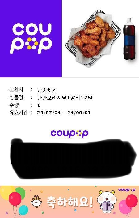 식사이벤당첨되서 교촌기프티콘받았어요.