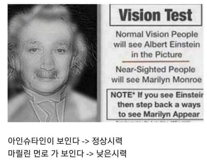 라탱크님의 댓글 라탱크 작성일 2024.07.11 17:26 이거 그냥 폰 가깝게 하고 보면 아인슈타인 보고 폰 멀리 하면 마릴린 먼로 보이네요 신고 이거 그냥 폰 가깝게 하고 보면 아인슈타인 보고 폰 멀리 하면 마릴린 먼로 보이네요