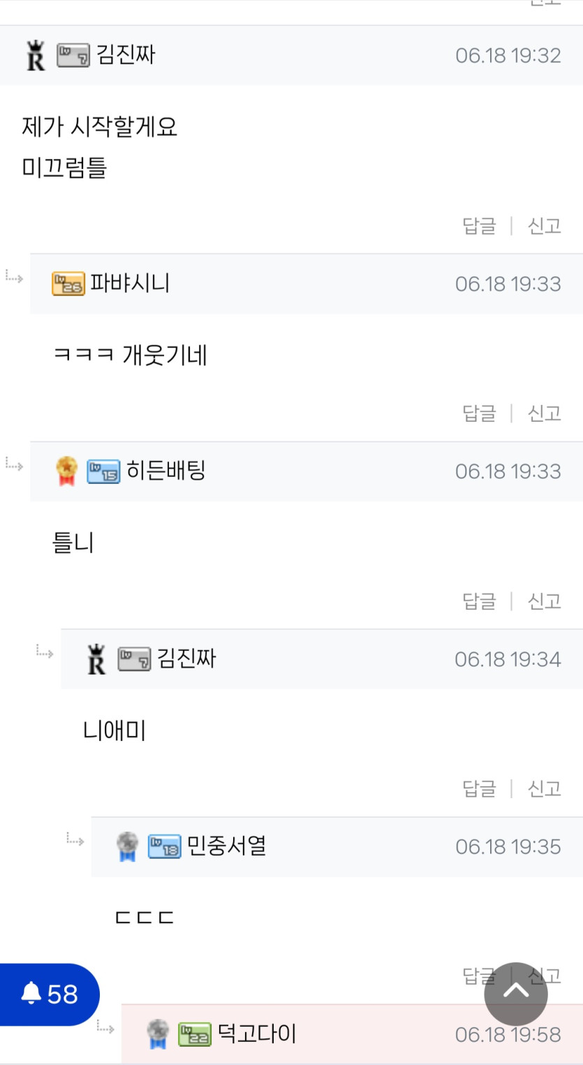 오늘의 레전드 글은 제가 한목했네요? 작성자 정보 김진짜 작성 작성일 2024.06.19 00:53 컨텐츠 정보 1,338 조회 11 댓글 목록 본문 민중서열님 히든님 조연 굿^^ 0 추천 신고 관련자료 댓글 11 덕고다이님의 댓글 덕고다이 작성일 2024.06.19 00:54 한몫하셧군요ㅋㅋㅋㅋ~~ 신고 한몫하셧군요ㅋㅋㅋㅋ~~ 파뱌시니님의 댓글의 댓글 파뱌시니 작성일 2024.06.19 01:02 두몫도 하시길 추천 ㅎㅎ 신고 두몫도 하시길 추천 ㅎㅎ 덕고다이님의 댓글의 댓글 덕고다이 작성일 2024.06.19 01:03 세몫은 시니님추천ㅎㅡㅎ 신고 세몫은 시니님추천ㅎㅡㅎ 파뱌시니님의 댓글 파뱌시니 작성일 2024.06.19 01:00 ㅋㅋ 다시바도웃기네 신고 ㅋㅋ 다시바도웃기네 덕고다이님의 댓글의 댓글 덕고다이 작성일 2024.06.19 01:02 레전더리 그잡채 신고 레전더리 그잡채 파뱌시니님의 댓글의 댓글 파뱌시니 작성일 2024.06.19 01:03 글겡 신고 글겡 덕고다이님의 댓글 덕고다이 작성일 2024.06.19 01:04 ㅇㅡㅇ 신고 ㅇㅡㅇ 덕고다이님의 댓글 덕고다이 작성일 2024.06.19 01:06 요리보고조리봐도 알수없는 둘리~?~ 신고 요리보고조리봐도 알수없는 둘리~?~ 성남은후님의 댓글 성남은후 작성일 2024.06.19 01:19 ㅋ끝말잇기 신고 ㅋ끝말잇기 에에에님의 댓글 에에에 작성일 2024.06.19 08:30 ○~○ 신고 ○~○ 로이열2님의 댓글 로이열2 작성일 2024.06.19 19:32 네? ㅋㅋㅋㅋㅋㅋ 신고 네? ㅋㅋㅋㅋㅋㅋ 로그인한 회원만 댓글 등록이 가능합니다. 목록