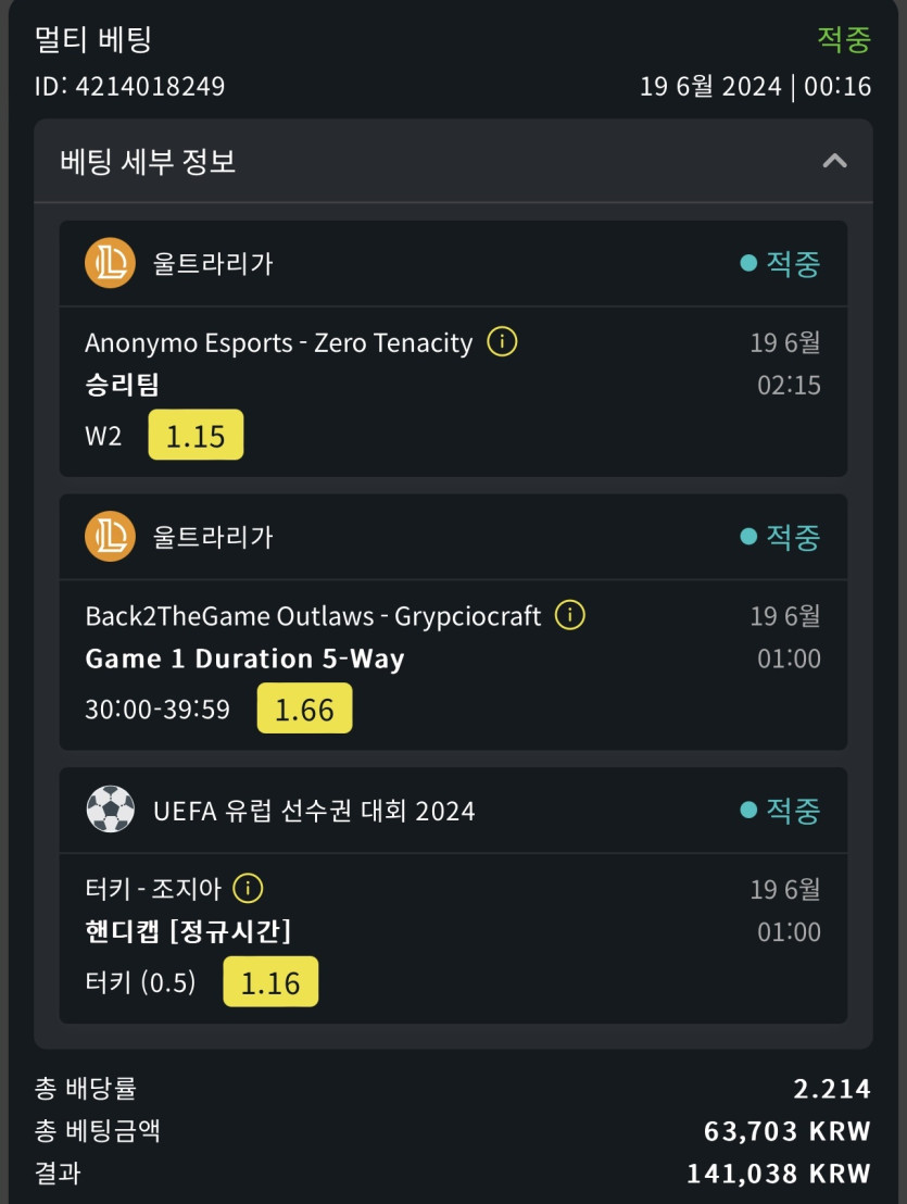 그리고 저번 시드 104,923에서 오늘 새벽에 제가 좋아하는 롤 경기를 메인으로 잡고 한박스만 걸었는데 다행이 적중했네요