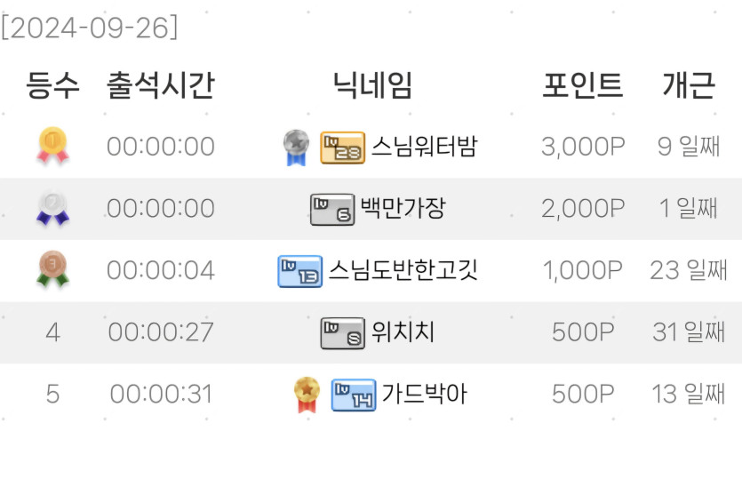 오늘 출석 작성자 정보 스님도반한고깃 작성 작성일 2024.09.26 00:03 컨텐츠 정보 276 조회 22 댓글 목록 본문 오늘은 경쟁자가 몇 없었네요...? 0 추천 신고 관련자료 댓글 22 스님워터밤님의 댓글 스님워터밤 작성일 2024.09.26 00:04 원래 그 시간이면 3등 불가인데...ㄷㄷ 신고 원래 그 시간이면 3등 불가인데...ㄷㄷ 스님도반한고깃님의 댓글의 댓글 스님도반한고깃 작성일 2024.09.26 00:05 그러니까요...좀 놀랐네유 신고 그러니까요...좀 놀랐네유 스님워터밤님의 댓글의 댓글 스님워터밤 작성일 2024.09.26 00:05 허무합니다요 신고 허무합니다요 스님도반한고깃님의 댓글의 댓글 스님도반한고깃 작성일 2024.09.26 00:07 저는 덕분에 3등 먹었네유 신고 저는 덕분에 3등 먹었네유 로이열2님의 댓글 로이열2 작성일 2024.09.26 00:11 출석 굿굿입니다! 신고 출석 굿굿입니다! 스님도반한고깃님의 댓글의 댓글 스님도반한고깃 작성일 2024.09.26 00:43 야물딱지게먹었네유 ㅋㅋ 신고 야물딱지게먹었네유 ㅋㅋ 히든배팅님의 댓글 히든배팅 작성일 2024.09.26 00:22 오늘 수요일 이고하니 다들 나른나른 경계심이없네요 다들 경각심 가집시다 ㅋㅋ 신고 오늘 수요일 이고하니 다들 나른나른 경계심이없네요 다들 경각심 가집시다 ㅋㅋ 스님도반한고깃님의 댓글의 댓글 스님도반한고깃 작성일 2024.09.26 00:44 다들 수요일도 퐈이아 해보자구요~ 신고 다들 수요일도 퐈이아 해보자구요~ 쿠쿠케케님의 댓글 쿠쿠케케 작성일 2024.09.26 00:33 1등 해보는 게 소원 신고 1등 해보는 게 소원 스님도반한고깃님의 댓글의 댓글 스님도반한고깃 작성일 2024.09.26 00:52 저도 해보고싶네유..ㅠ 신고 저도 해보고싶네유..ㅠ 스님워터밤님의 댓글의 댓글 스님워터밤 작성일 2024.09.26 07:56 캬캬캬 신고 캬캬캬 스님도반한고깃님의 댓글의 댓글 스님도반한고깃 작성일 2024.09.26 08:02 왜 웃어욬ㅋㅋ 신고 왜 웃어욬ㅋㅋ 망고마미님의 댓글의 댓글 망고마미 작성일 2024.09.26 01:27 미 222 신고 미 222 스님도반한고깃님의 댓글의 댓글 스님도반한고깃 작성일 2024.09.26 08:02 1등...저는 언제쯤..ㅜㅜ 신고 1등...저는 언제쯤..ㅜㅜ 망고마미님의 댓글의 댓글 망고마미 작성일 2024.09.26 16:27 저두... ㅎㅎ 신고 저두... ㅎㅎ 소용돌이님의 댓글 소용돌이 작성일 2024.09.26 01:09 출첵을이제하러! ㅎ 신고 출첵을이제하러! ㅎ 스님도반한고깃님의 댓글의 댓글 스님도반한고깃 작성일 2024.09.26 08:02 여유있게 오셨군요 신고 여유있게 오셨군요 망고마미님의 댓글 망고마미 작성일 2024.09.26 01:26 이제출석했어여... 신고 이제출석했어여... 스님도반한고깃님의 댓글의 댓글 스님도반한고깃 작성일 2024.09.26 08:03 헉...여유넘치는 망고님 신고 헉...여유넘치는 망고님 로이열2님의 댓글 로이열2 작성일 2024.09.26 20:18 그러게요 다들 어디가셨나 신고 그러게요 다들 어디가셨나 스님도반한고깃님의 댓글의 댓글 스님도반한고깃 작성일 2024.09.26 21:19 오늘도 한가하면 좋겠네유...^^ 신고 오늘도 한가하면 좋겠네유...^^ 돈키호테님의 댓글 돈키호테 작성일 2025.11.06 13:49 화이팅여 ㅎ 신고 화이팅여 ㅎ 로그인한 회원만 댓글 등록이 가능합니다. 목록