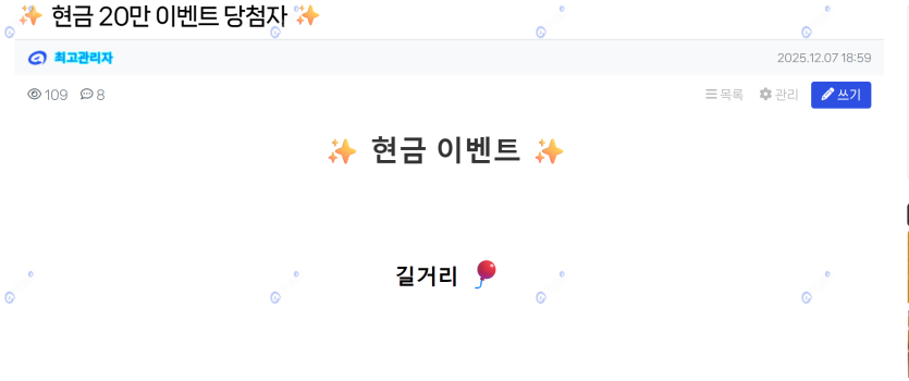 연말 잘 보내시고 다음 현금이벤트의 행운은 제가 아닌 다른 회원님께 잘 돌아갔으면 좋겠습니다.