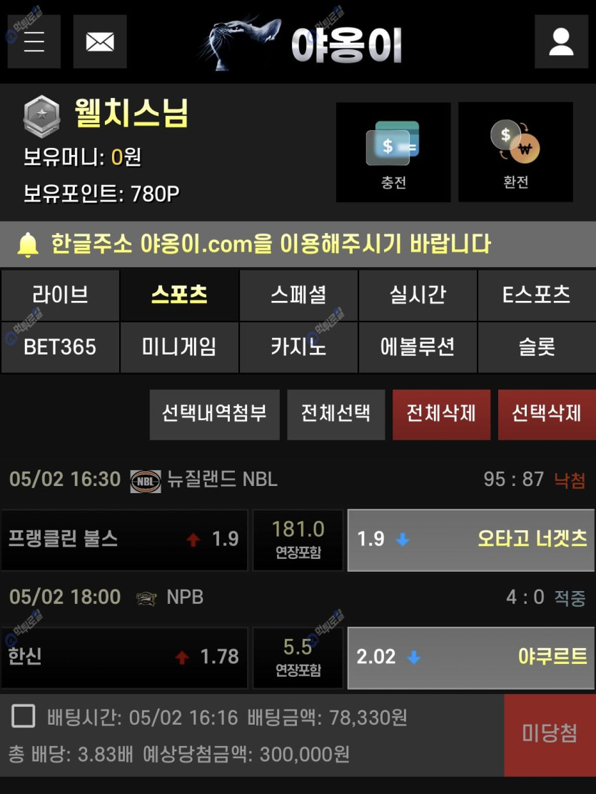 요즘 야옹이 스포츠 배당이 좋아서 자주 이용하네요