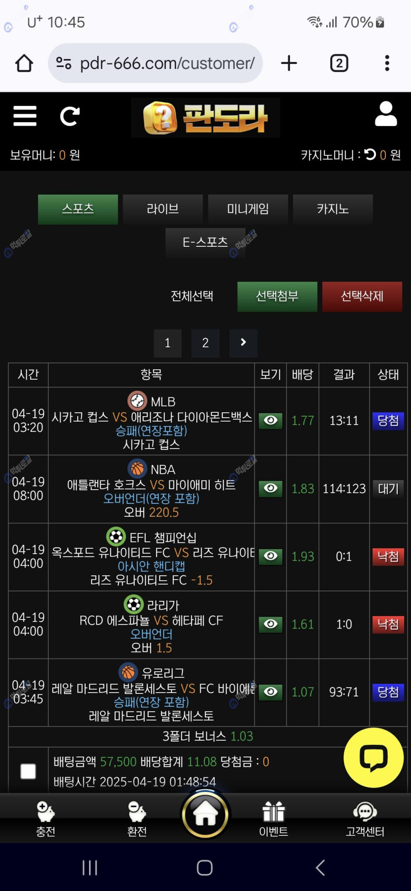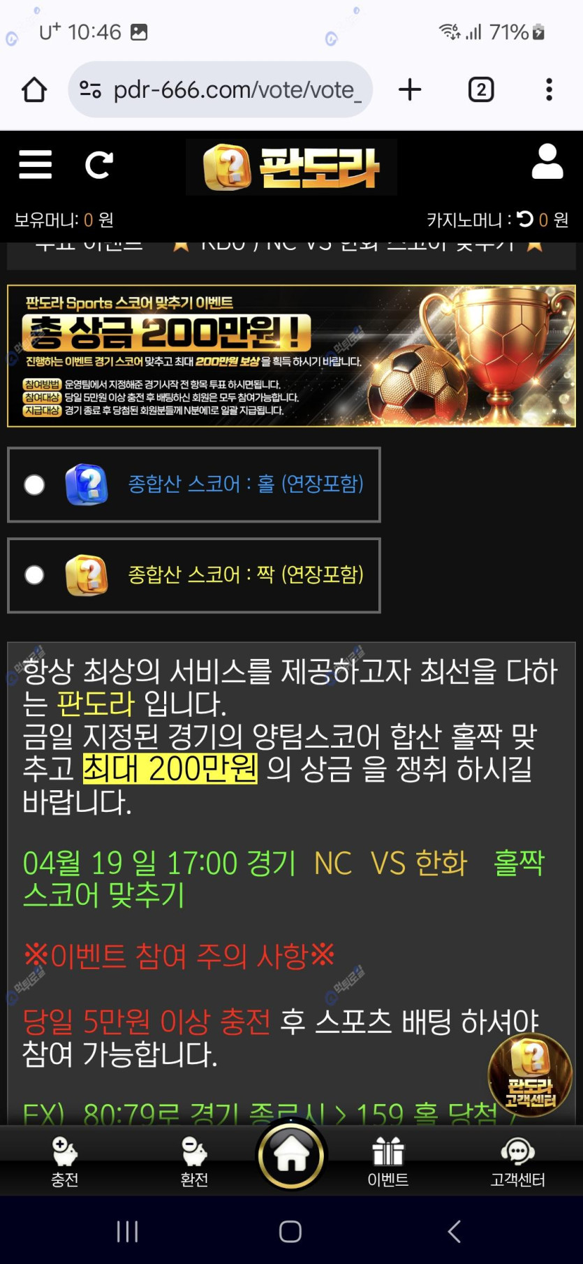 새벽에 5만 충전해서 베팅한거 낙이네요.그치만 5만이상 충전해서 스포츠 베팅 했으니 게시판 이벤트 참여조건 충족되서 참여 했어요^^우취만 나지 않기를 바랍니다.판도라 이벤트 끝판왕.입니다.한번 둘러보세요~~~^^