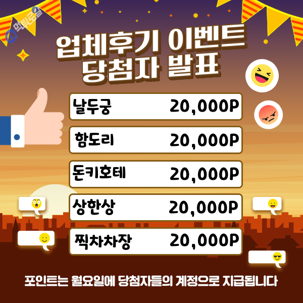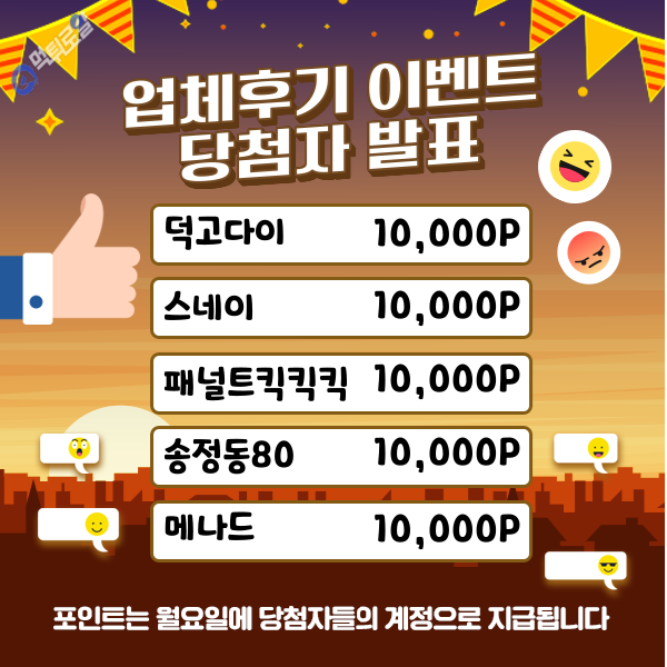 ★ 10월20일 ~ 10월26일 업체후기 당첨자 발표 ★
