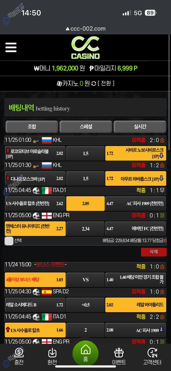 담당실장이 입플준다는거 안받고했는데 오늘은 한번 받고 해보려했더니 충전할일이없어서 당첨금으로 오늘배구랑 축구 질러놓고