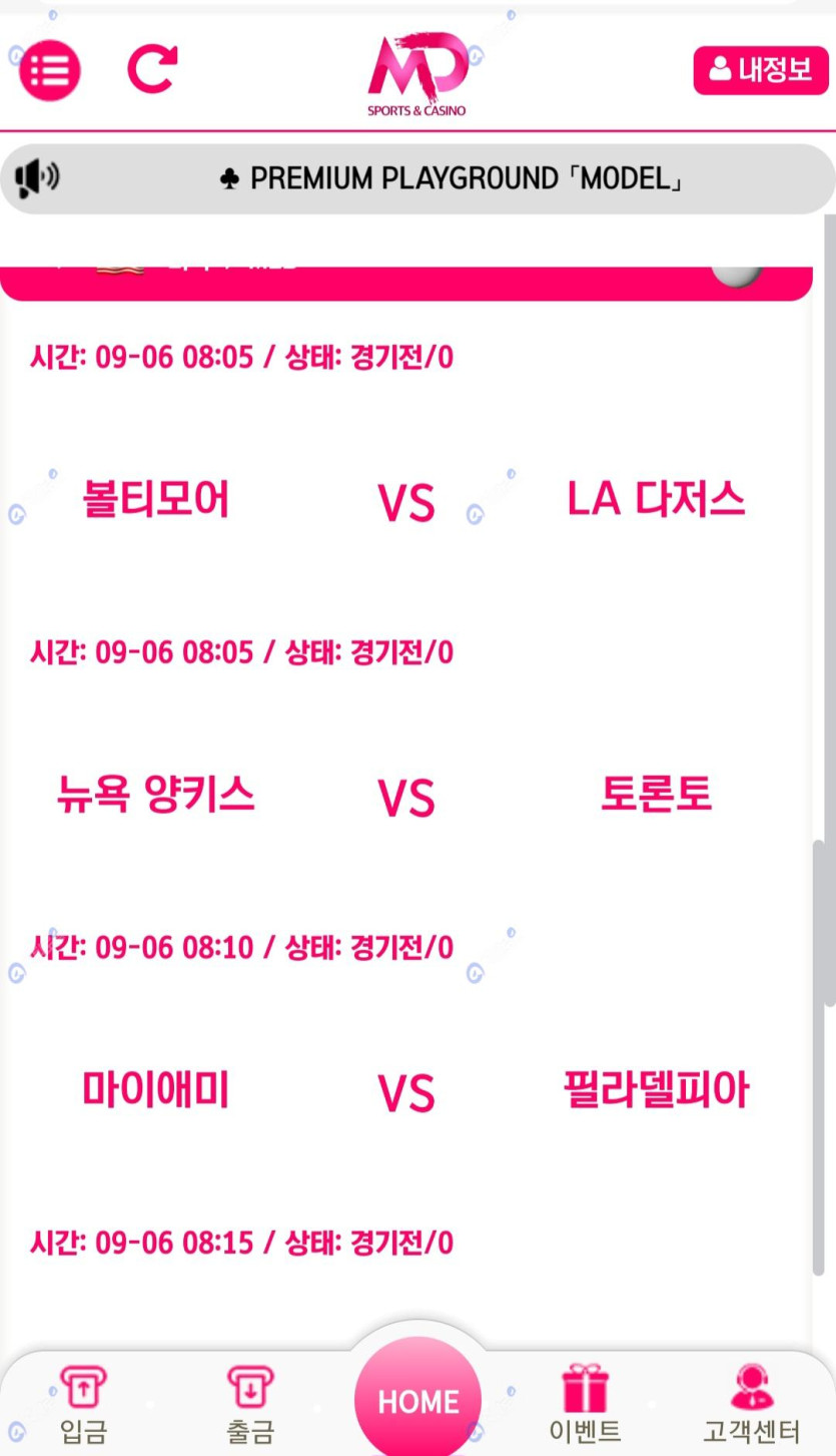 스포츠 적합 모델싸이트입니다~ 배당도 아주 잘떨어지게 나오며 빠른 충환 기본이면서 실시간이 재미많이 볼수있고 갑자기 지고있을때 고배당도 노려볼수있는 실시간(인플레이) 한번 해보시는것도 괜찮으실듯 합니다!