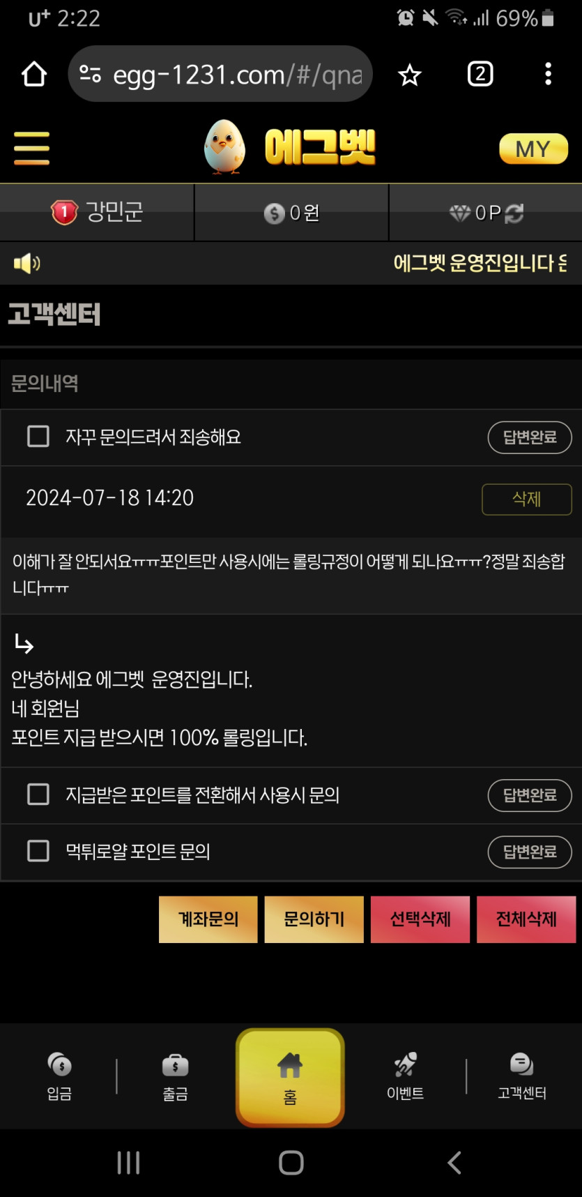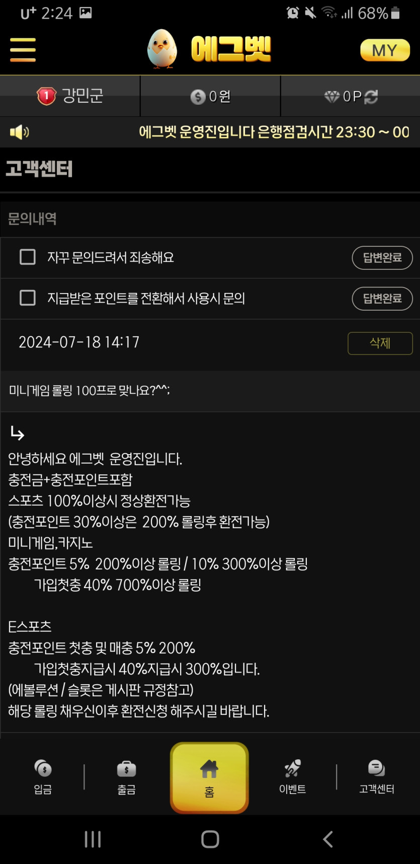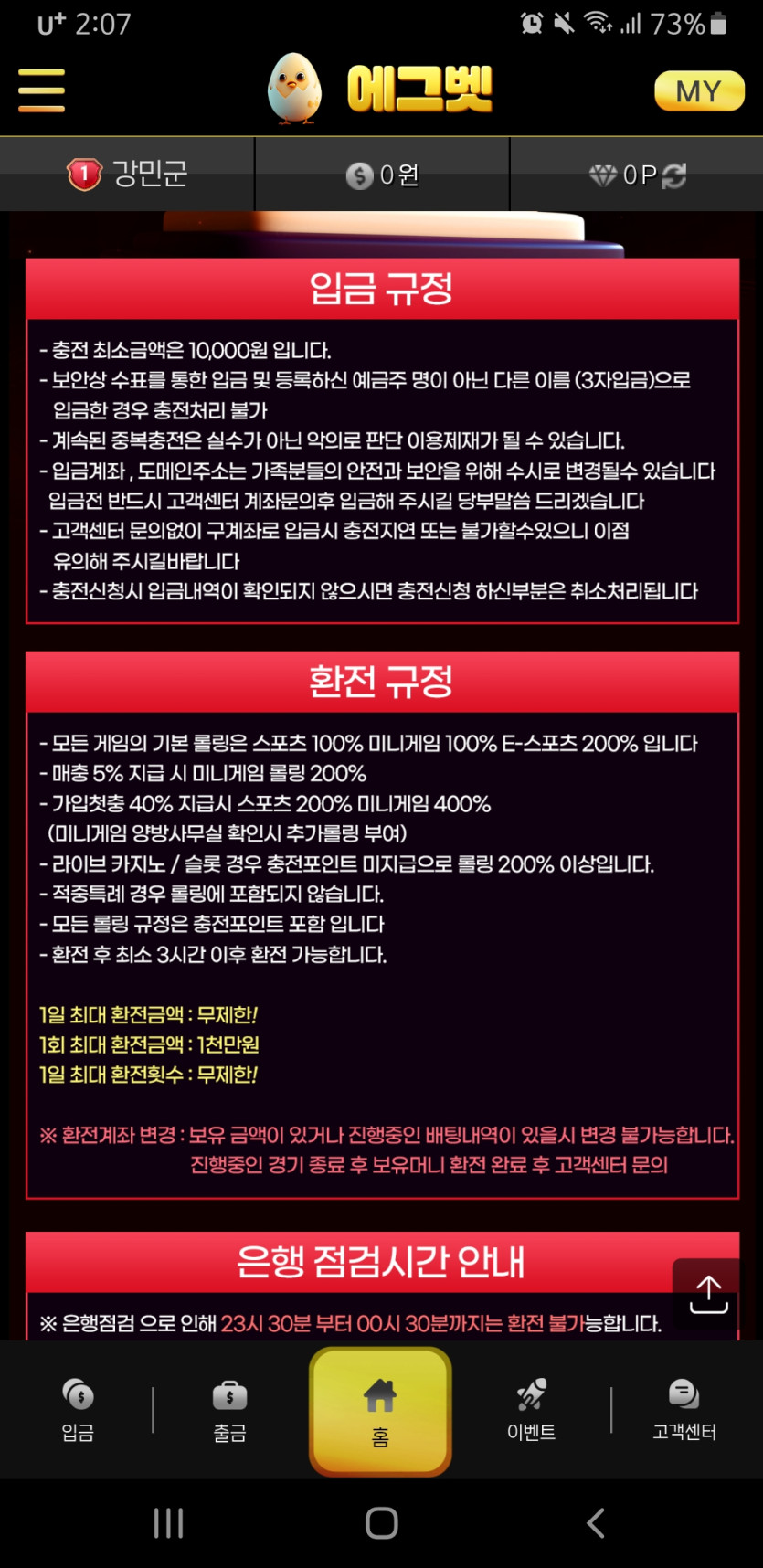 제휴는 호빵맨 쓰다가 먹로 포인트교환이 월욜 일괄지급이라^^;에그벳 이용 해봤습니다~~~일단 포인트교환한것도 똑같이 미겜롤링 100프로라고 해서 이용해봤습니다.환전하고 3시간후 재환전 가능하니까 참고하시면 될거 같아요~~~^^맞다 고객센터가 친절 합니다.포인트관련문의 3번했는데 답변도 빠르고요^^;