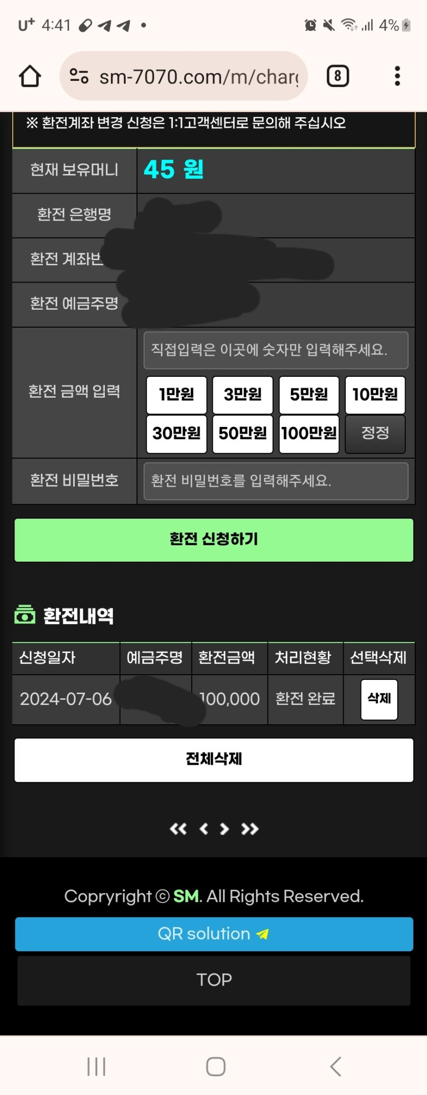 Sm 경우 배팅에 문제가 없을 경우 정말 빠른 환전처리를 해주었습니다.