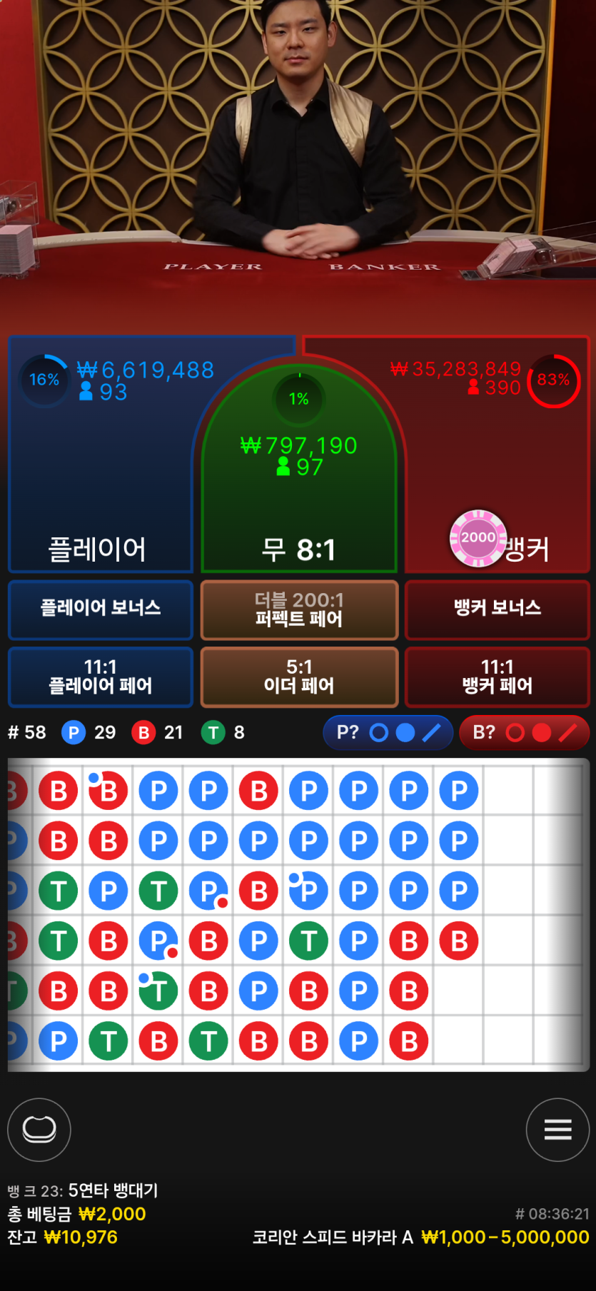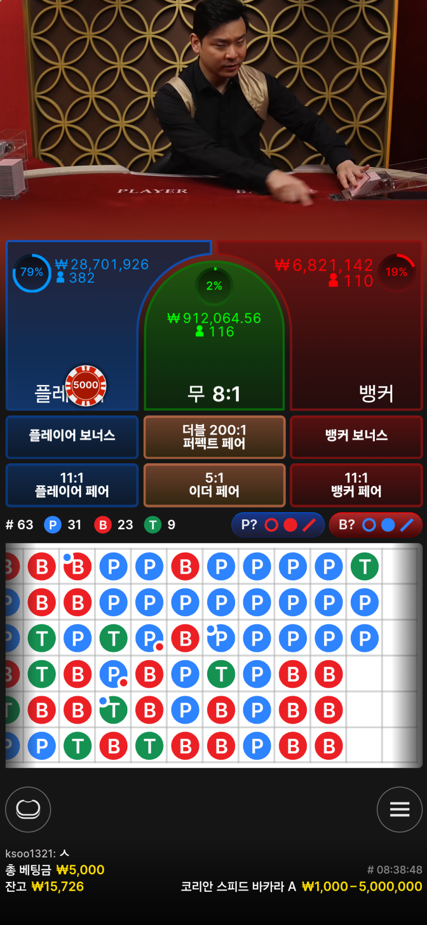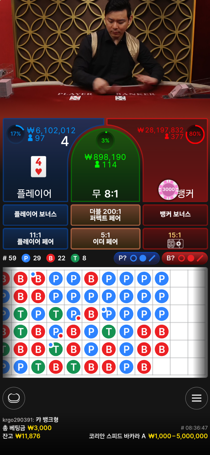기존 라바카지노 잔고, 500+10000원이었다가, 소소하게 룰렛 돌리고, 바카라를 시작했습니다. 딱 처음에 들어갔을 때 일단 판의 흐름을 보려고 플레이어, 뱅커가 나온 개수부터 봤습니다. 그런데 이게 뭐야... P가 연속으로 9번이나 떠서 일단 한턴기달렸습니다. 그러다가 뱅커가 딱 나오고, 그다음 판에서 다들 뱅커에 거는 상황이어서 바로 뱅커에 1000을 넣고, 950원 얻고, 바로 다음에 2번 쉬었다가 다들 P에 찍길래 P에 찍었으나 B가 나오는 바람에 1000원을 잃었습니다 ㅋㅋㅋ, 그다음부터는 1000원, 2000원, 3000원, 5000원까지 넣고, 3만 원? 까지 갔다가 5000원을 잃는 바람에 뭔가 더 이상 하면 잃을 거 같아서 1출 2 마감으로 끝내고, 남은 5000원으로 지금부터 다시 시작하러 갑니다!!