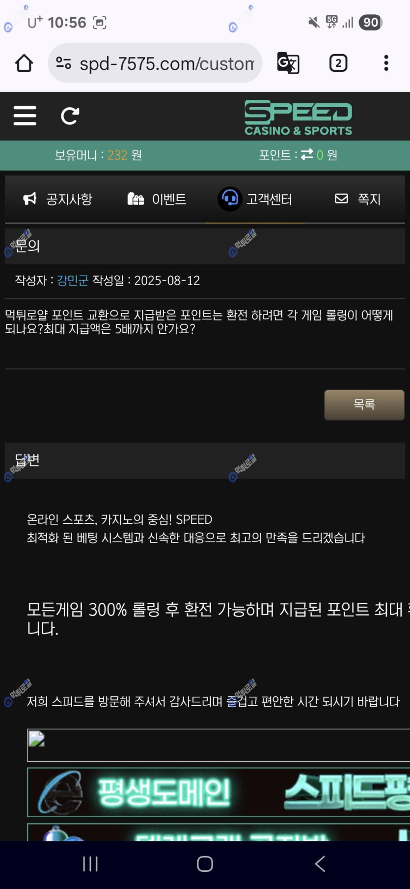 사이트 이름 처럼 포교 겁나 빠르네요.근데 롤링이 모든게임 300프로ㅠㅠ 환전은 5배까지 입니다~~~실시간 베팅한거부터 적중되야 겠어요ㅎㅎ어쨌든 빠른 포교 감사합니다.