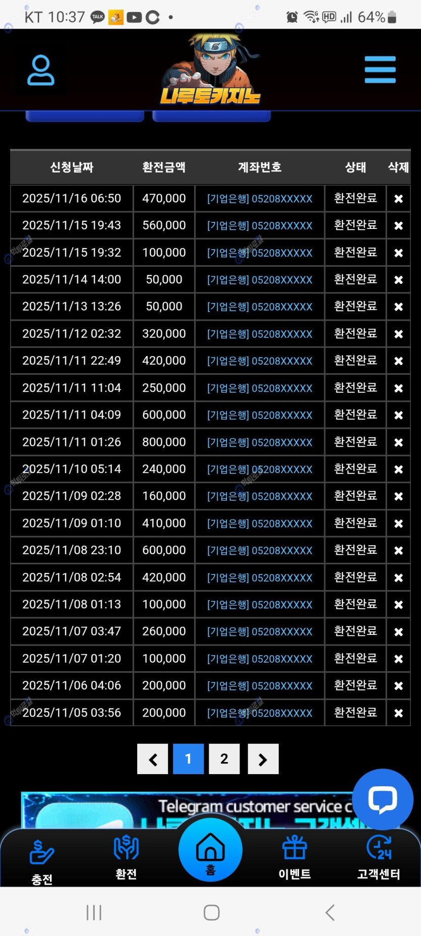 현재 전 레벨2 에 누적충전 1억 넘어야 하는 레벨 2 달동안 단한번도 사고가 없었습니다 소액이든 아니든 말이지요 구멍가게 말고 나루토 믿고 쓰기 너무 좋은거 같습니다 추천 합니다