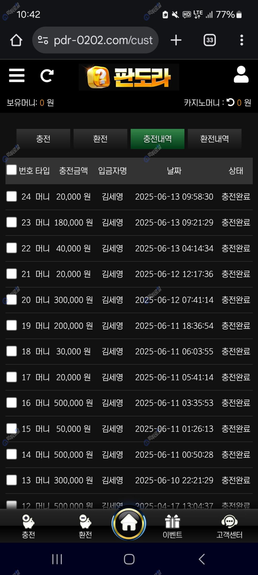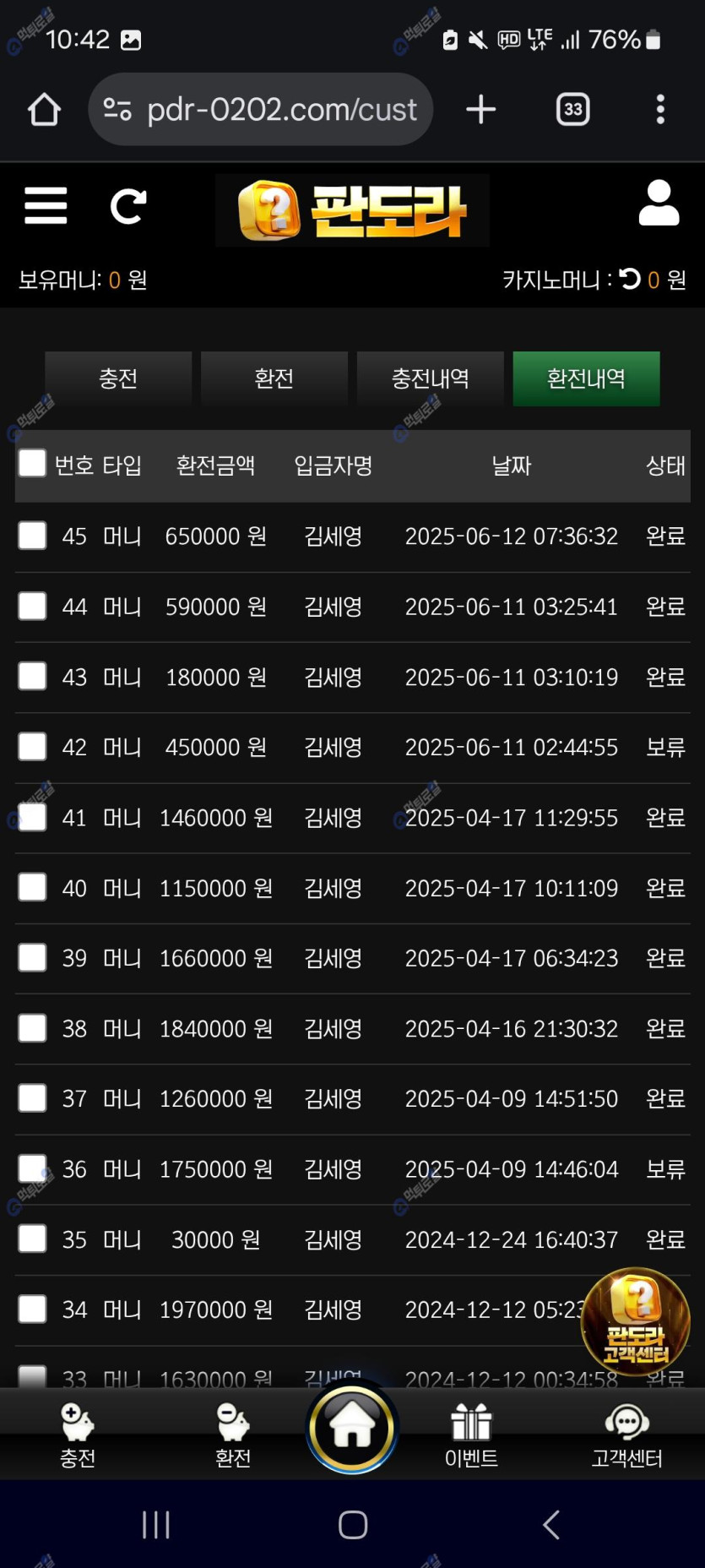 제가 뱃끝나고 지우는 버릇이 있어 뱃내역은 없는데 판도라 가입하고 1년정도 되었는데 많이 이용하진 않았으나 충환전 문제 절대없고 라이브도 타사보다 제제많이 유하고 일단 경기 확정이 되면 돈이 바로 들어오니 그점이 너무좋습니다..