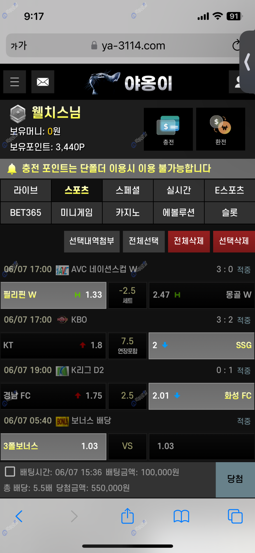 포인트 구매후 야옹이에 교환해서 스포츠 베팅했는데