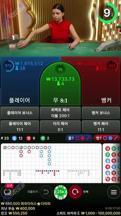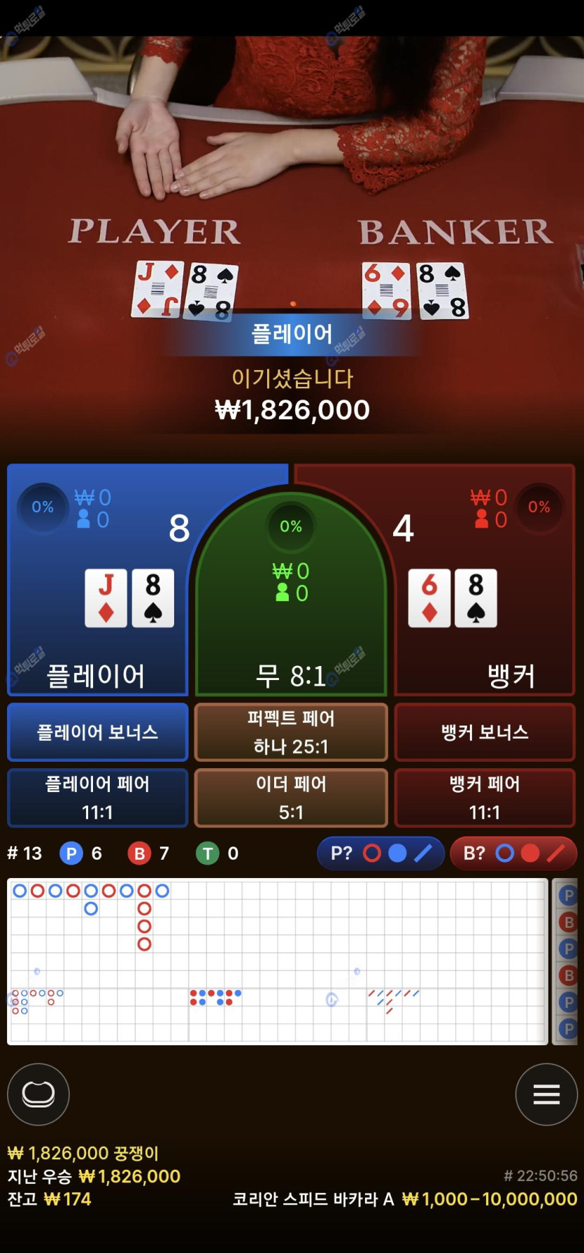 뱅커 우위 상황에서는 뱅커만 플레이어 우위면 플레이어만 가는 방식입니다