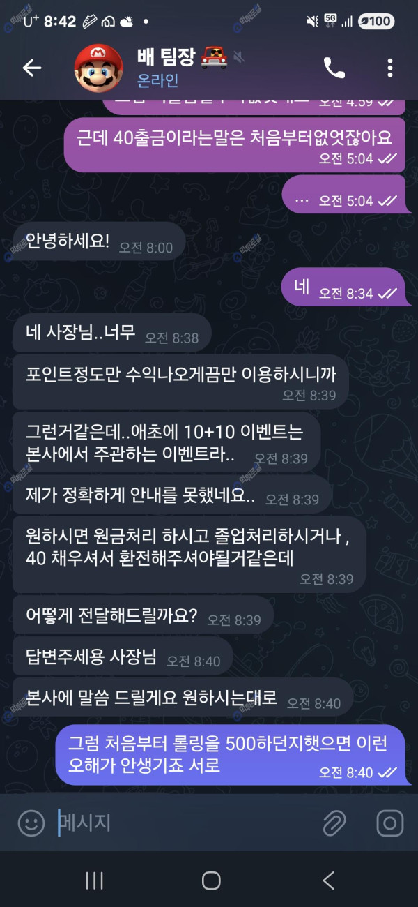 10+10입플가능하다고해서 가입함. 종목뭐할거냐고해서 슬롯한다고하니 롤링200% 라고해서 20출발해서 롤링 다 채우고 27만원되서 환전신청했더니 사이트측에서 40만들어서 환전치던지 원금10만 들고가라고 요구 그래서 이용안할테니 10달라고했더니 아디탈퇴후 텔레그램등등 모두 삭제한 상태. |