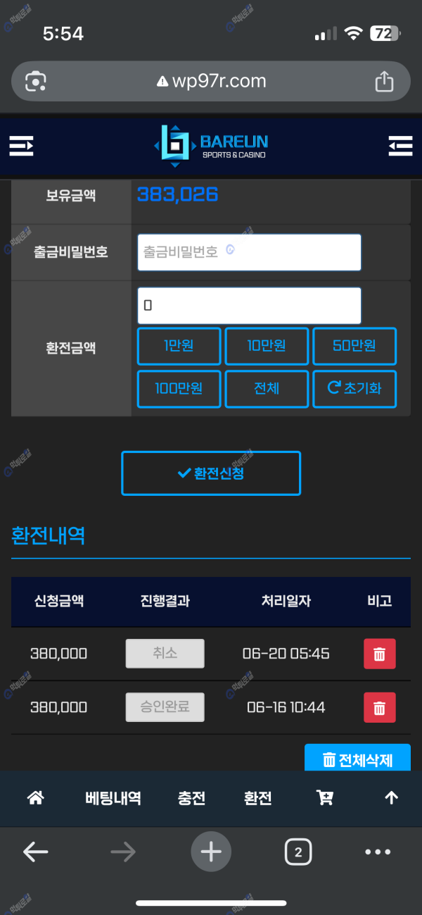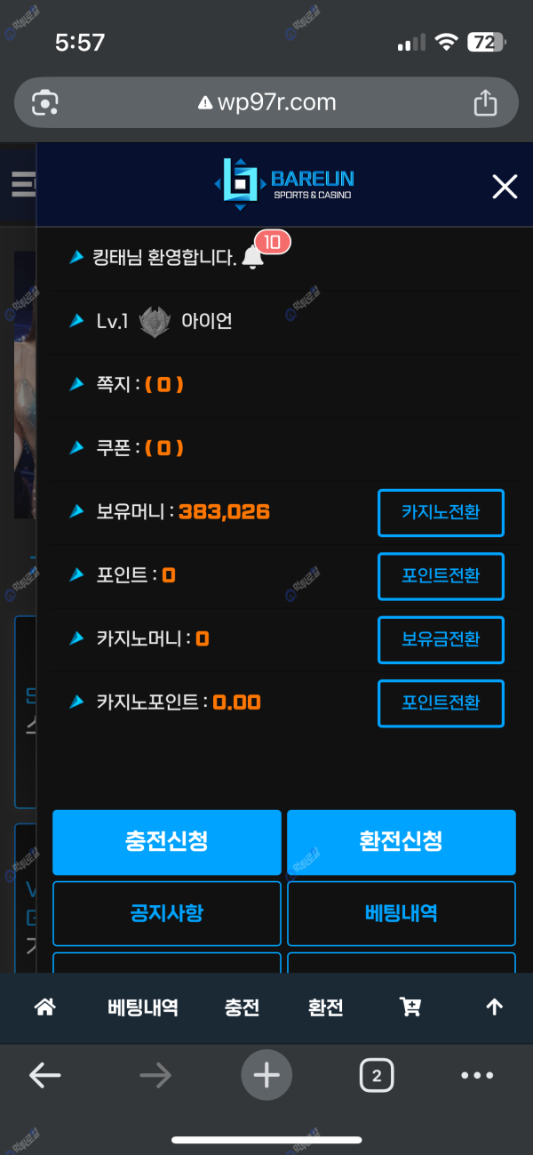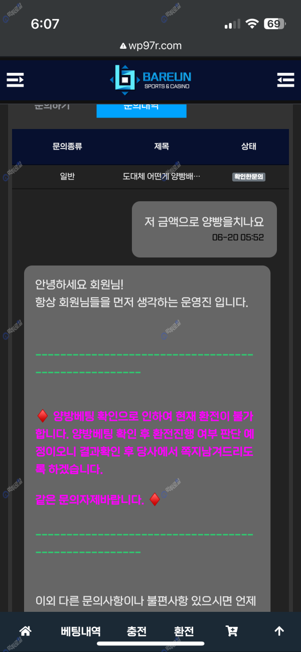 5만원충전하고 첫충전10프로받고 3폴적중하니 무슨 양빵 영어드립하면서 검수하고 쪽지 주겠단 개 호로 잡사이트 입니다 조심하시고요 다른분도 먹당하셨다는데 그냥 환전버튼 없다보심됩니다 일정금액 이상 손해보면 바로 영어치네요
