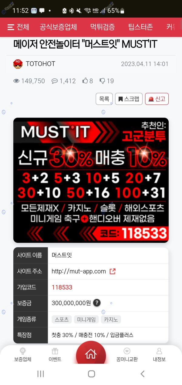 | 안녕하세요? 형제님들 토토핫에 제휴업체인 머스트잇에 가입하고 몇번 이용했습니다. 원래 구글링해보면 먹튀글이 두세건 있는데라 안하던곳인데 당당실장 이란놈이 2만원짜리 쿠폰 여러차레 주고 가족방까지 운영하고 있길래 의심없이 이용했습니다. 대개 잃을때가 많았고 이날은 30만원 입금하고 슬롯으로 130만원까 올렸습니다. 출금할 생각도 없이 그냥 재밌게 놀고있는데 갑자기 돈이 사라지는겁니다. 새로고침하고 재로그인 하려니까 아이디 잠가버리고 그데로 먹튀했는데 저는 당연히 토토핫에 먹튀글 올리고 항의했습니다. 토토핫은 답변을 제데로 못하고있다가 두차례 항의하니까 저를 강제 탈퇴시키 더군요? 저는 슬롯만해서 양방도 아니고 그전까지 비록 큰도은 아니지만 줄곳 잃고있었기 때문에 아무하자 걸릴게 없어습니다. 먹튀 당한건 당한건데 토토핫을 끼고 먹튀 당하는건 처음 격는 일이라 너무 어이없고 황당해서 글을 올리게 되었습니다. | |
